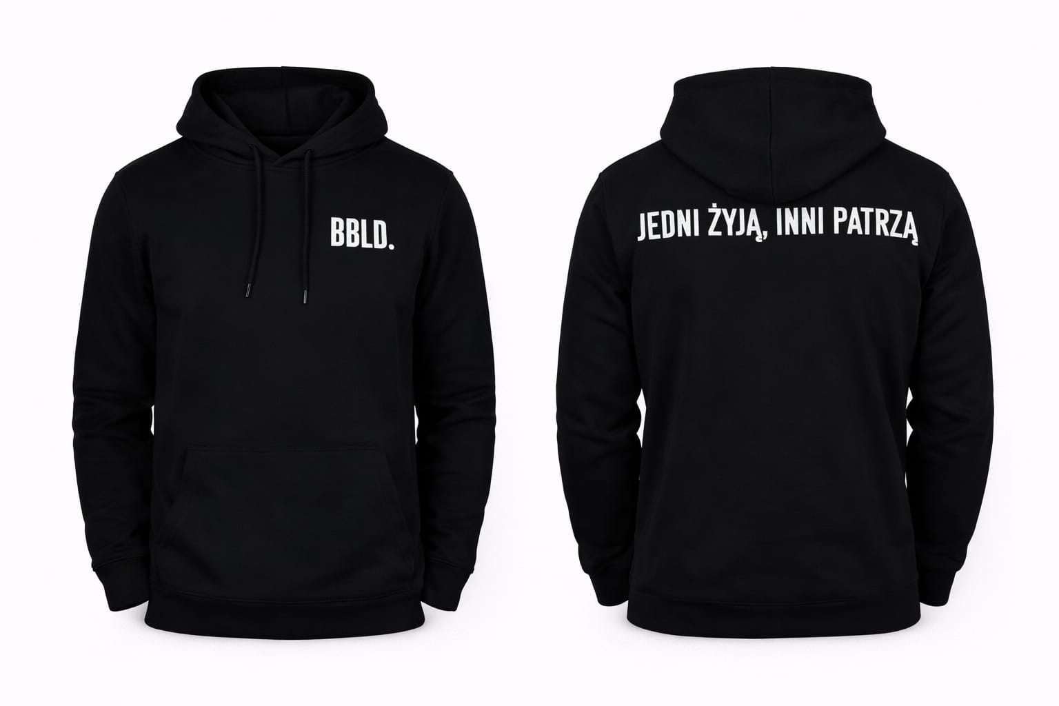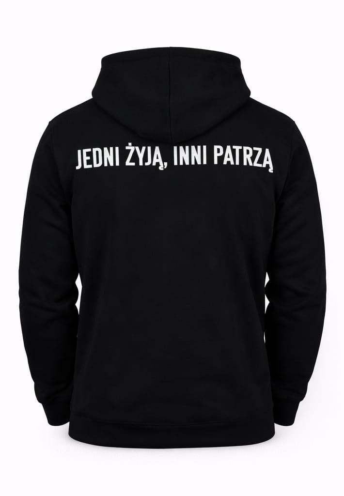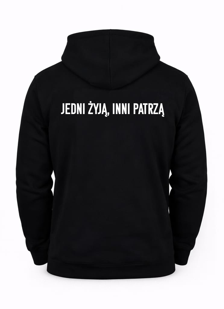 Na przodzie bluzy widnieje hasło „BBLD.” – odniesienie do filozofii marki BEBOLD, która zachęca do bycia odważnym i autentycznym. Na plecach znajdziesz dodatkowy, motywujący napis: „JEDNI ŻYJĄ, INNI PATRZĄ”. To przesłanie, które przypomina, by nie stać w miejscu i odważnie podążać za swoimi marzeniami.