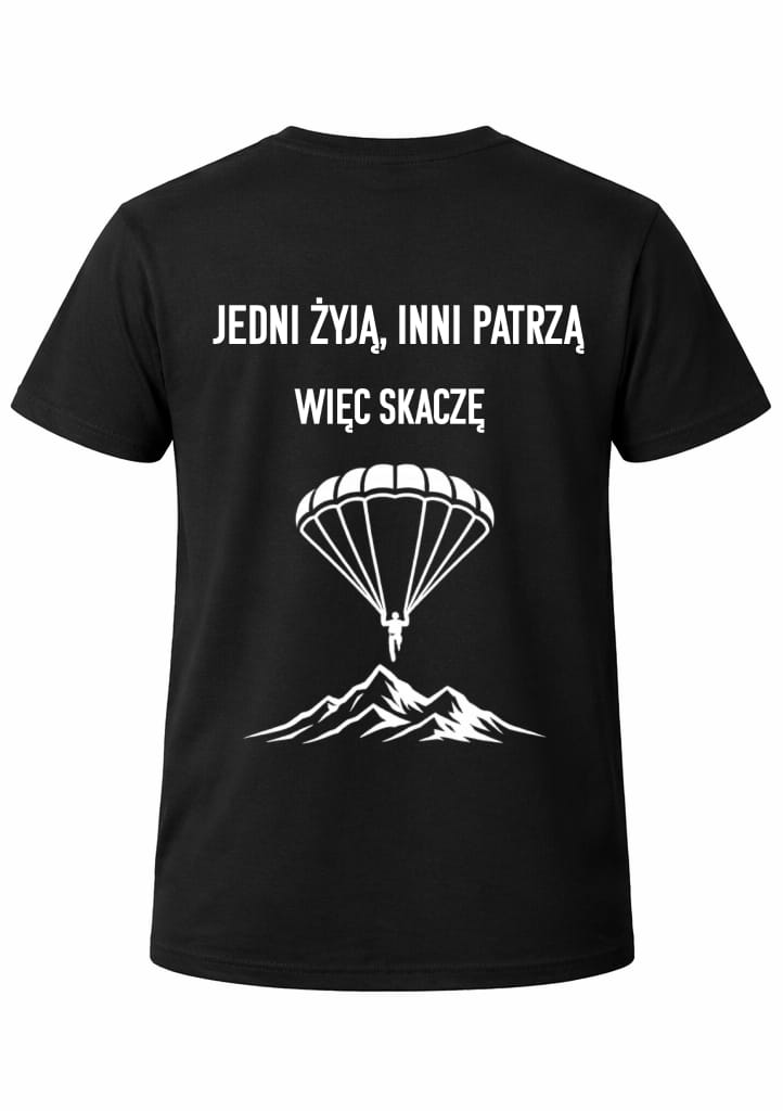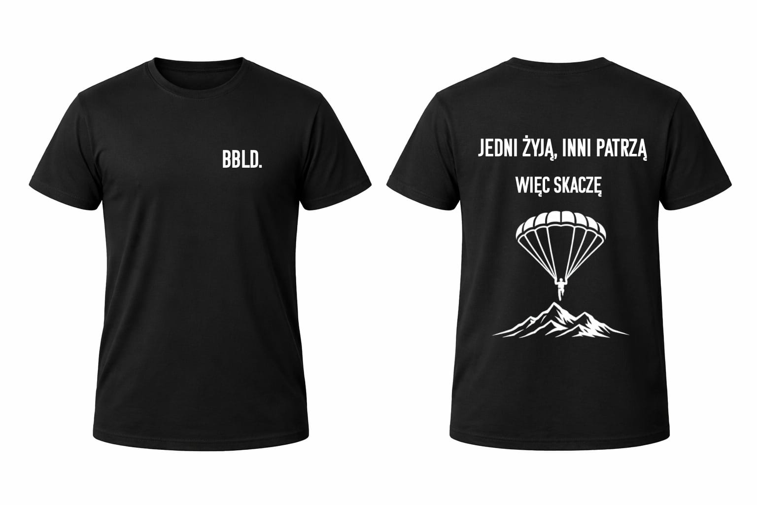Z przodu koszulki znajduje się wyrazisty biały napis „BBLD.”, który jest bezpośrednim nawiązaniem do filozofii marki BEBOLD – bądź odważny, bądź sobą. Na plecach natomiast umieszczono inspirujące hasło „JEDNI ŻYJĄ, INNI PATRZĄ”, które motywuje do działania i wyjścia ze strefy komfortu.