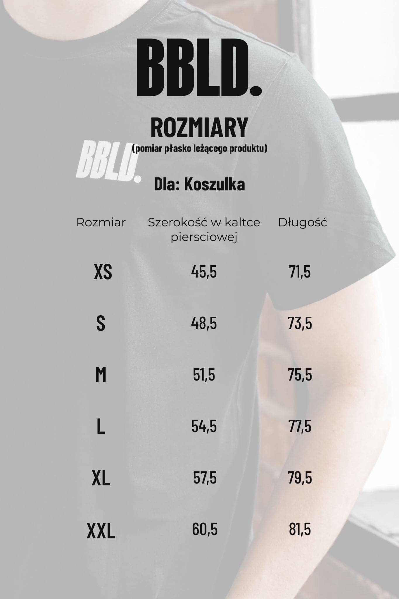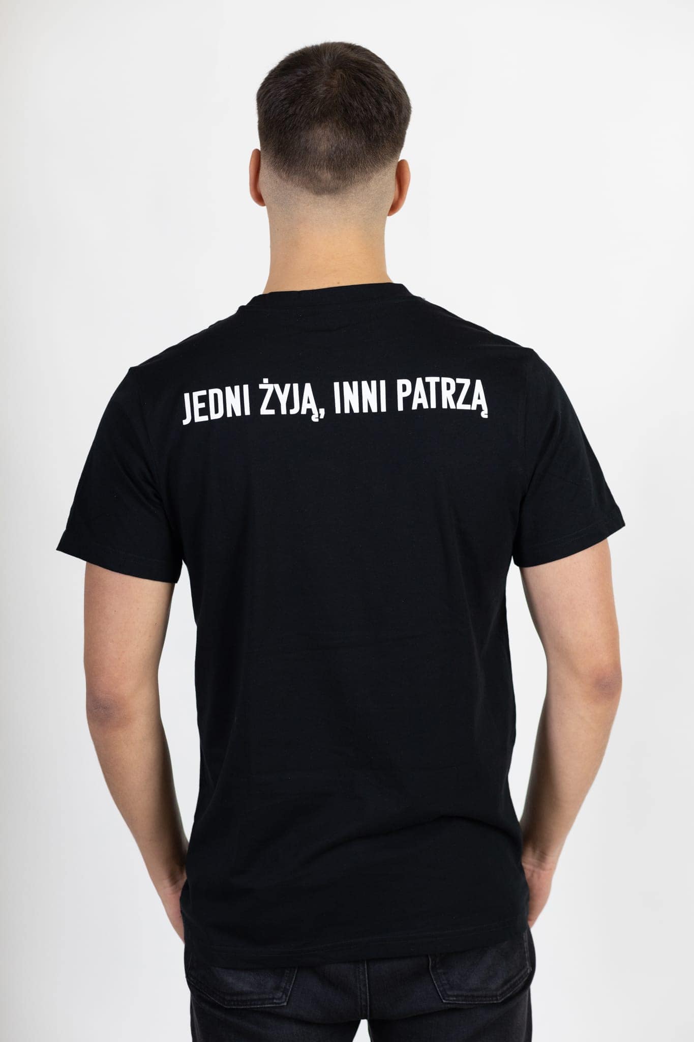 Z przodu koszulki znajduje się wyrazisty biały napis „BBLD.”, który jest bezpośrednim nawiązaniem do filozofii marki BEBOLD – bądź odważny, bądź sobą. Na plecach natomiast umieszczono inspirujące hasło „JEDNI ŻYJĄ, INNI PATRZĄ”, które motywuje do działania i wyjścia ze strefy komfortu.
